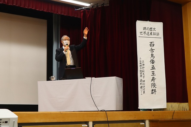 11月 4日(火) 午後 1:30~ 3:30 堺の歴史・世界遺産探訪 百舌鳥倭五王寿陵群 上海師範大学 特約研究員 小谷城郷土館 理事 森村 健一さん 堺の歴史は古墳の多さを見ても分かるように古く, 又、奥深いなと改めて思いました。先生はまだまだ伝える事が尽きないご様子でした。